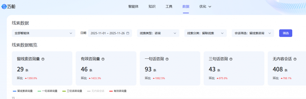 经过优化调整后,广告投放效果得到了显著改善。目前,钧测的广告投放每日稳定能收获5-6条咨询,产生2-3条有效线索,且咨询--线索转化率始终维持在较高水平。