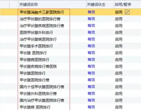 进入关键词规划师,点击搜索,如“甲状腺治疗”,系统就会为你推送与甲状腺治疗相关的各种关键词。