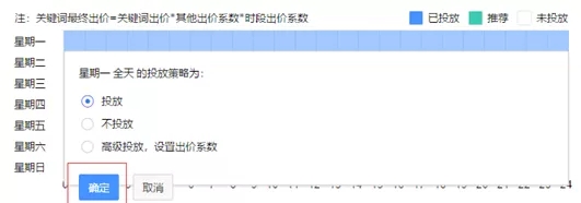 和地区投放一样,时段投放也可以调整各个时段的出价比例,选择高级投放就可以为时段设置单独的出价比例了。