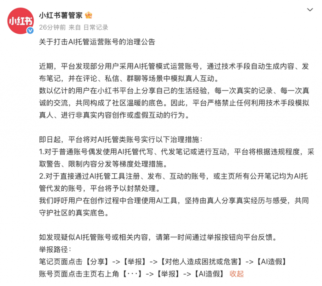 3月10日,小红书官方账号“薯管家”发布了一则关于打击AI托管运营账号的重磅治理公告。即日起,小红书将针对“AI托管运营账号”进行全平台专项治理,对完全由AI托管的账号实施封禁处理。