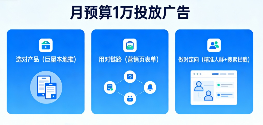 月预算1万,在全国范围内投放ISO认证广告,并非不可能。关键在于选对产品(巨量本地推)、用对链路(营销页表单)、做对定向(精准人群+搜索拦截)。