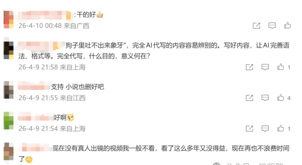 这场由微信发起的“AI内容整治风暴”,让我想起了3月份的时候,小红书平台发布针对AI生成内容的整治通告以及去年今日头条处理超260万条低质AI内容,对常发AI垃圾的作者限流禁言。还有抖音2026第一季度处理4.2万条AI擦边低俗内容,封禁1.4万个账号。
