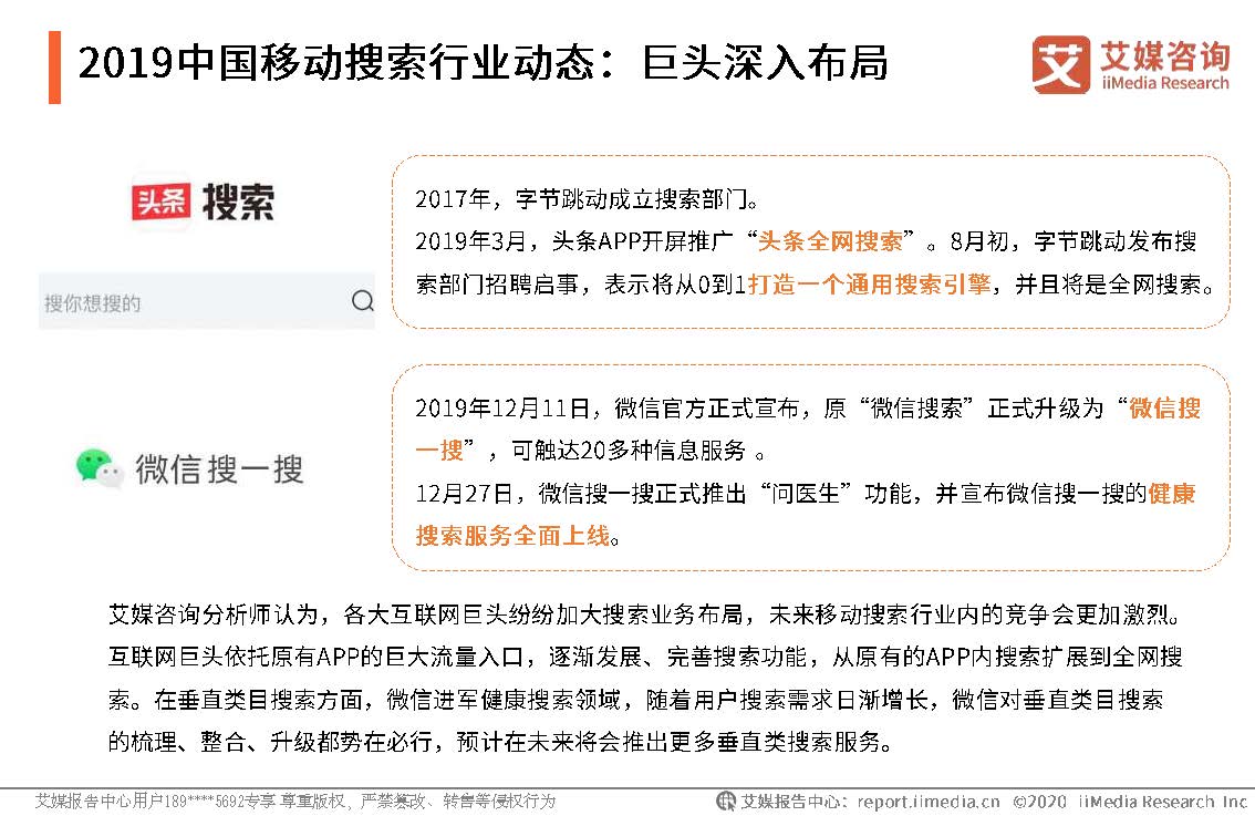 移动搜索用户达7.05亿人,2020将迎激烈竞争年。2019年第四季度中国移动搜索用户已达7.05亿人,规模保持稳定增长态势。与此同时,各大互联网巨头平台更加注重在搜索行业的布局,而神马搜索、搜狗搜索等平台也继续加强发展步伐,面对庞大的市场,2020年移动搜索将迎来激烈竞争年。